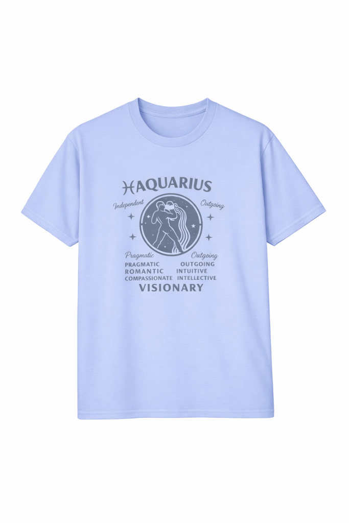 This Aquarius tee features a crisp black silhouette paired with traits like “Visionary,” “Intuitive,” and “Romantic” in a clean, centered layout. The water‑pourer emblem anchors the design, surrounded by subtle stars and personality highlights. Printed on smooth, flat fabric in your choice of vibrant colors, this shirt is perfect for astrology lovers who lead with originality.
